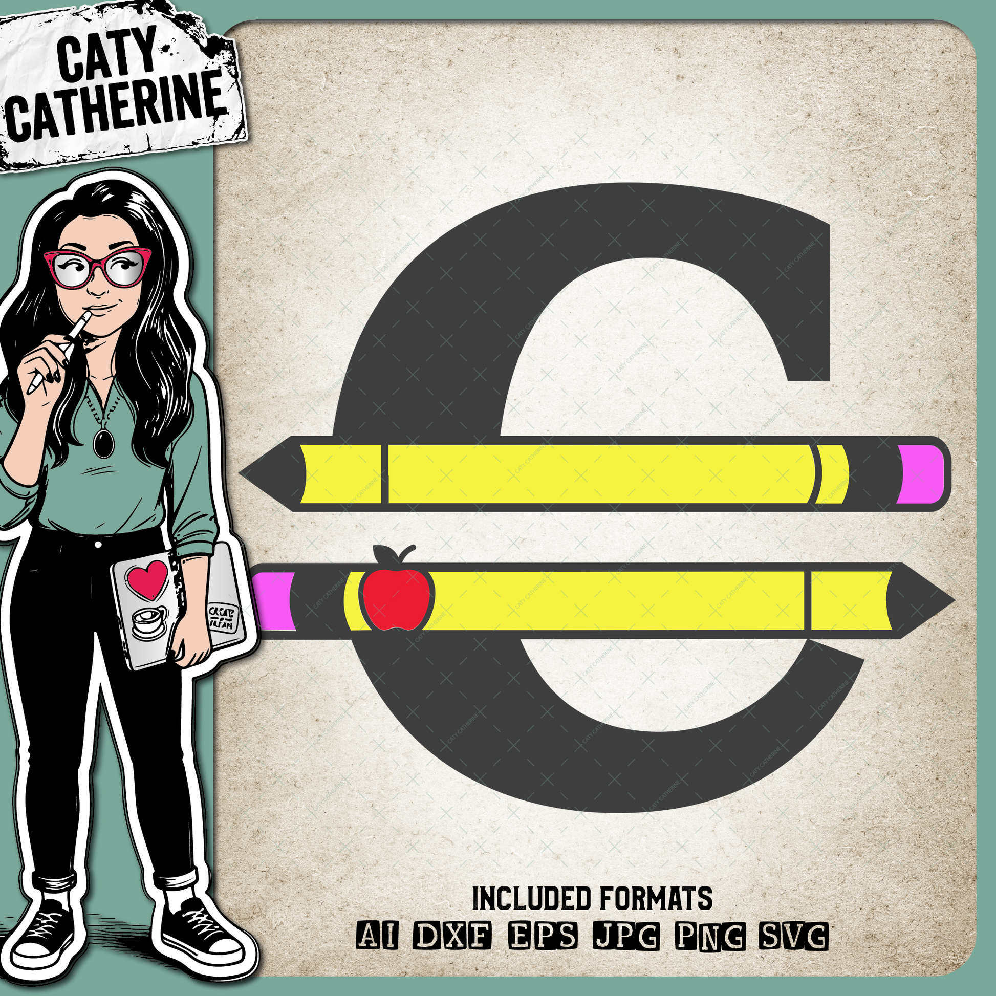 Letter C Split Teacher Monogram with Pencil and Apple Detail – Monograms SVG Design by Caty Catherine