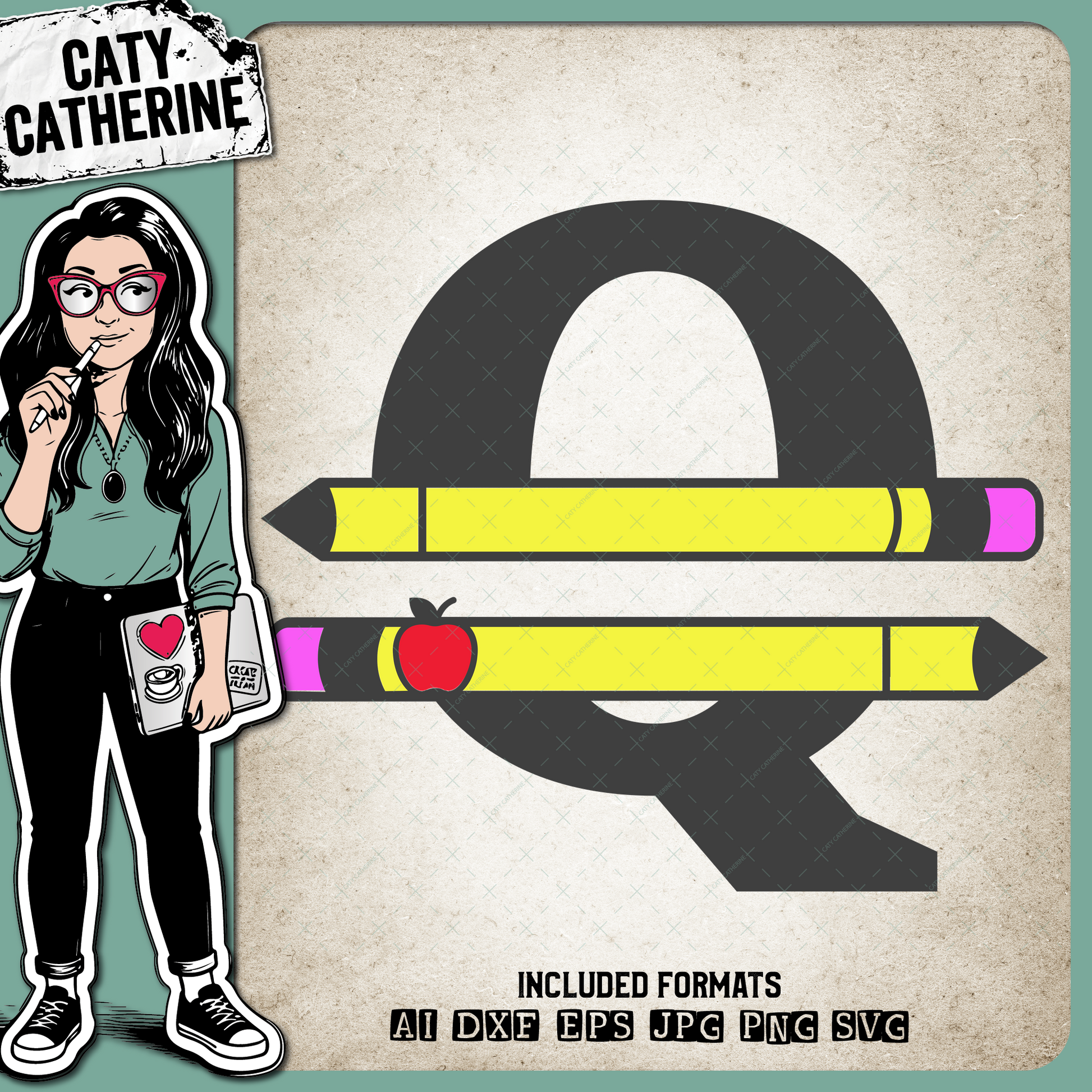 Letter Q Split Teacher Monogram with Pencil and Apple Detail – Monograms SVG Design by Caty Catherine