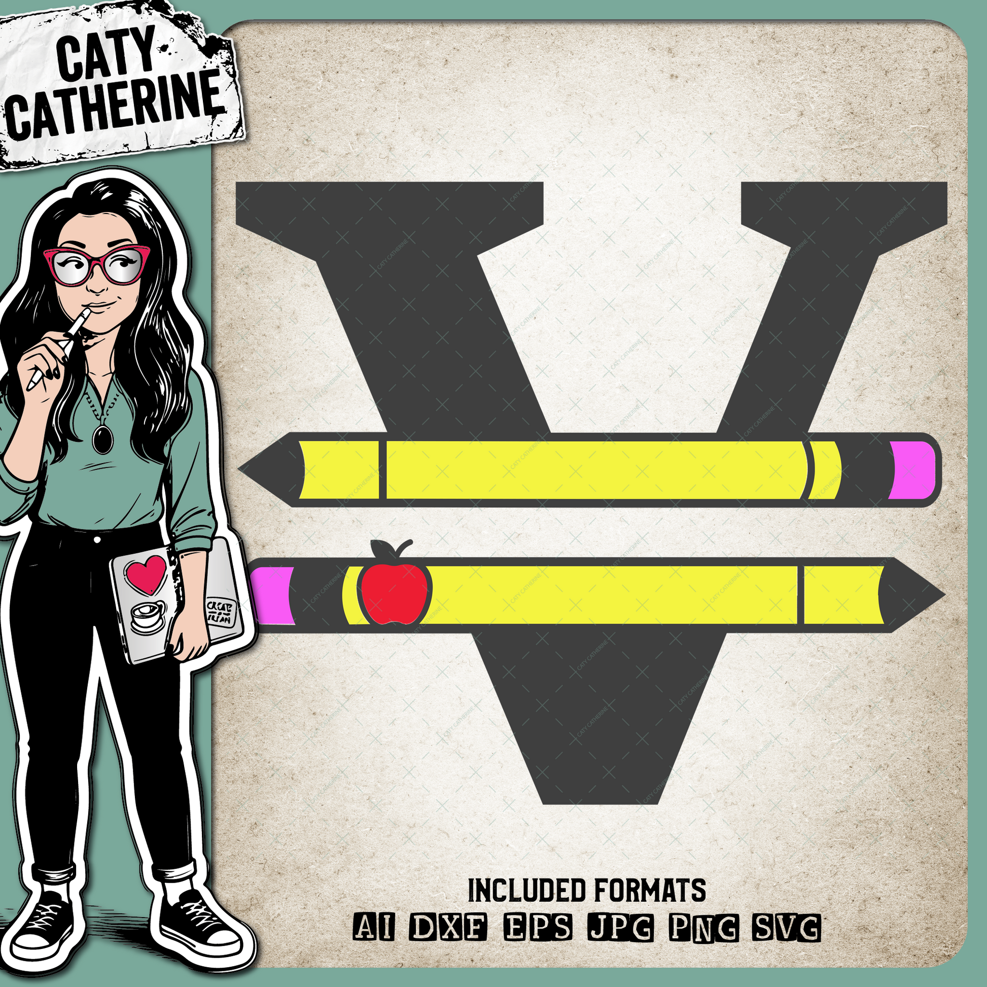 Letter V Split Teacher Monogram with Pencil and Apple Detail – Monograms SVG Design by Caty Catherine
