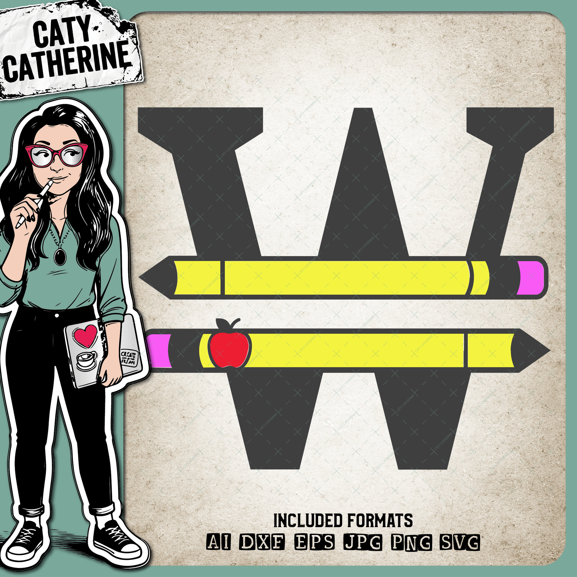 Letter W Split Teacher Monogram with Pencil and Apple Detail – Monograms SVG Design by Caty Catherine