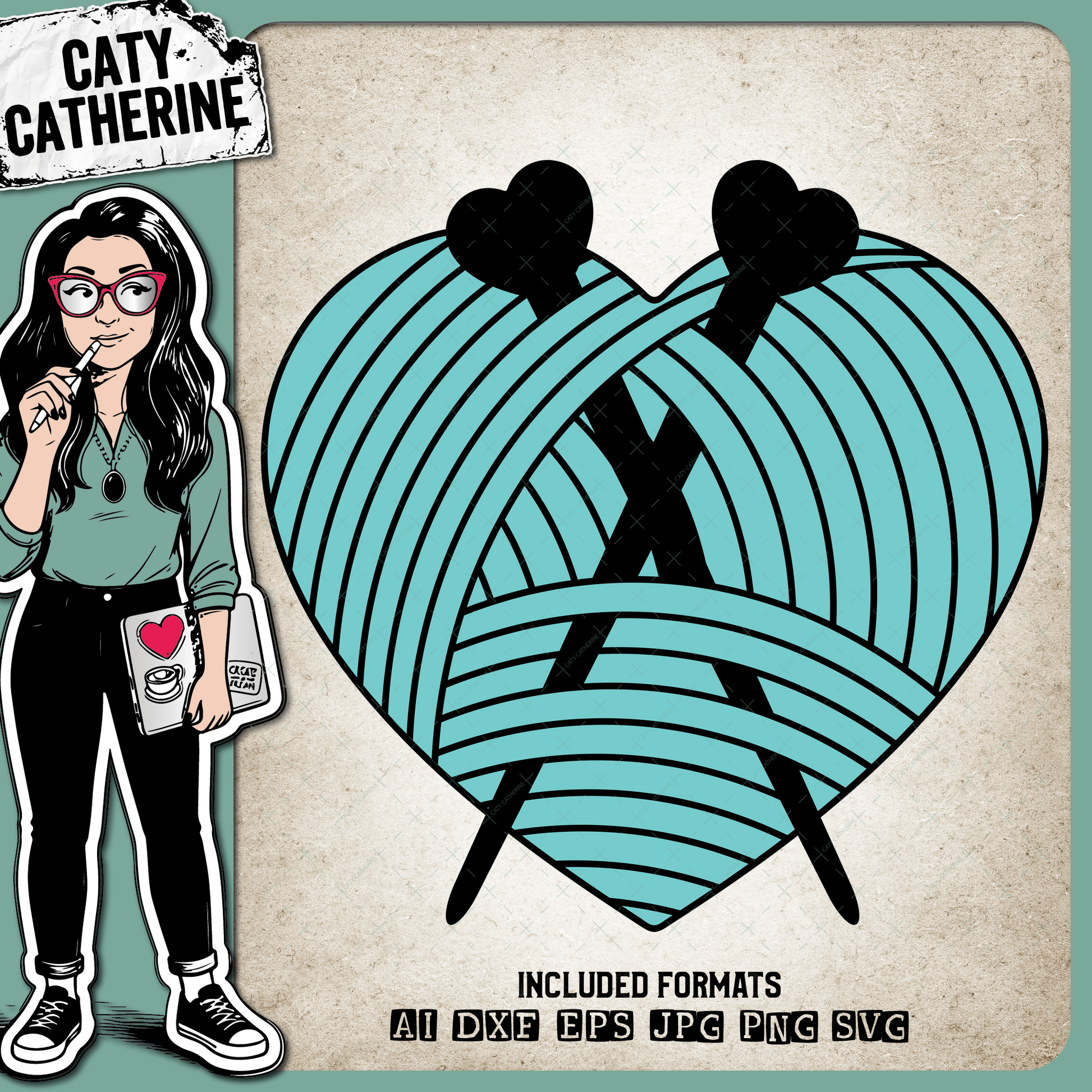 • Love Heart Yarn Ball of Wool with Knitting Needless – SVG Design by Caty Catherine